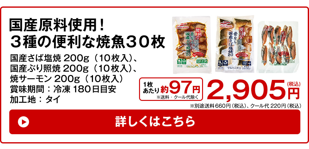 - お届け内容 国産さば塩焼200g(10枚入)、国産ぶり照焼200g(10枚入)、焼サーモン200g(10枚入)