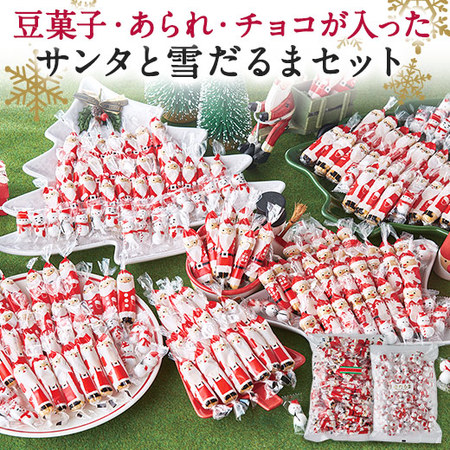 可愛いサンタと雪だるまのパッケージに豆菓子・あられとチョコを入れました。
