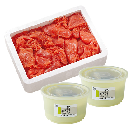 - お届け内容 ●博多の味辛子明太子1kg切れ子(1kg×1箱)、数の子松前折れ子1.2kg(600g×2樽)