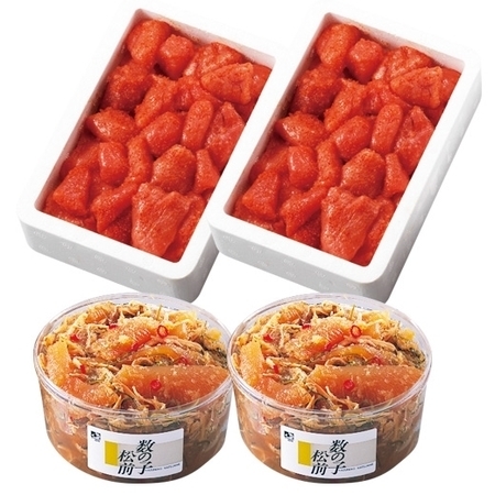- お届け内容 ●博多の味辛子明太子2kg(1kg×2箱)、数の子松前1.6kg(800g×2樽)