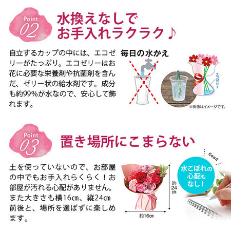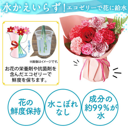 自立するカップの中には、エコゼリーがたっぷり。エコゼリーはお花に必要な栄養剤や抗菌剤を含んだ、ゼリー状の給水剤です。成分も約99%が水なので、安心して飾れます。