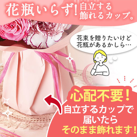 花束を贈るときには「花瓶持ってるかな…」と心配になることも。そのまま飾れるカラーブーケなら、花瓶を持っていなくても大丈夫!自立するカップに入っているので、もらったらそのまま飾れます。