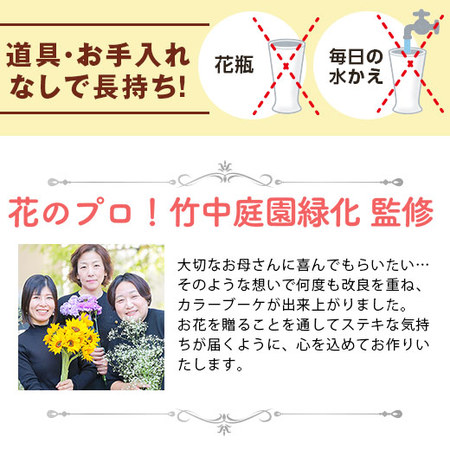 大切なお母さんに喜んでもらいたい…そのような想いで何度も改良を重ね、カラーブーケが出来上がりました。