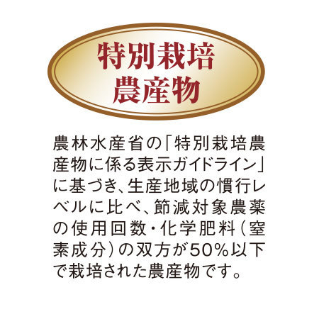 農林水産省の「特別栽培農産物に係る表示ガイドライン」に基づき、生産地域の慣行レベルに比べ、