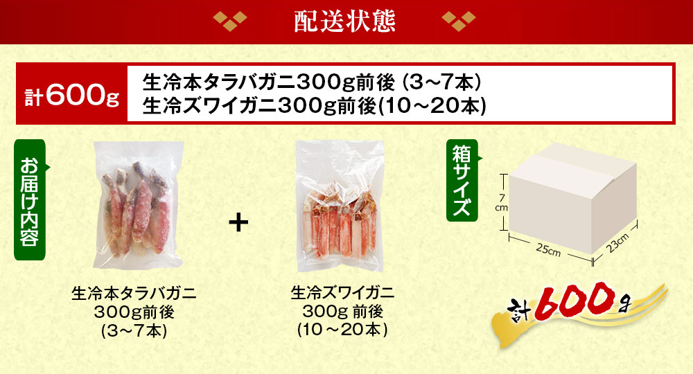 ●生冷本タラバガニポーション300g、生冷ズワイガニポーション300g