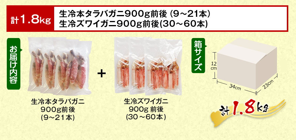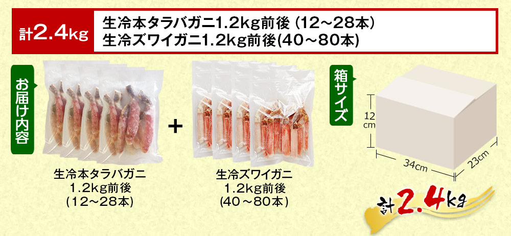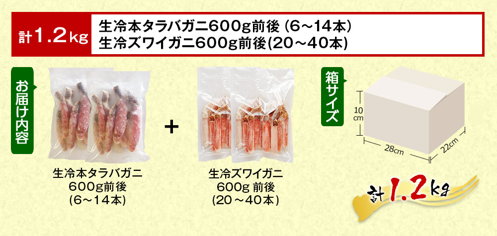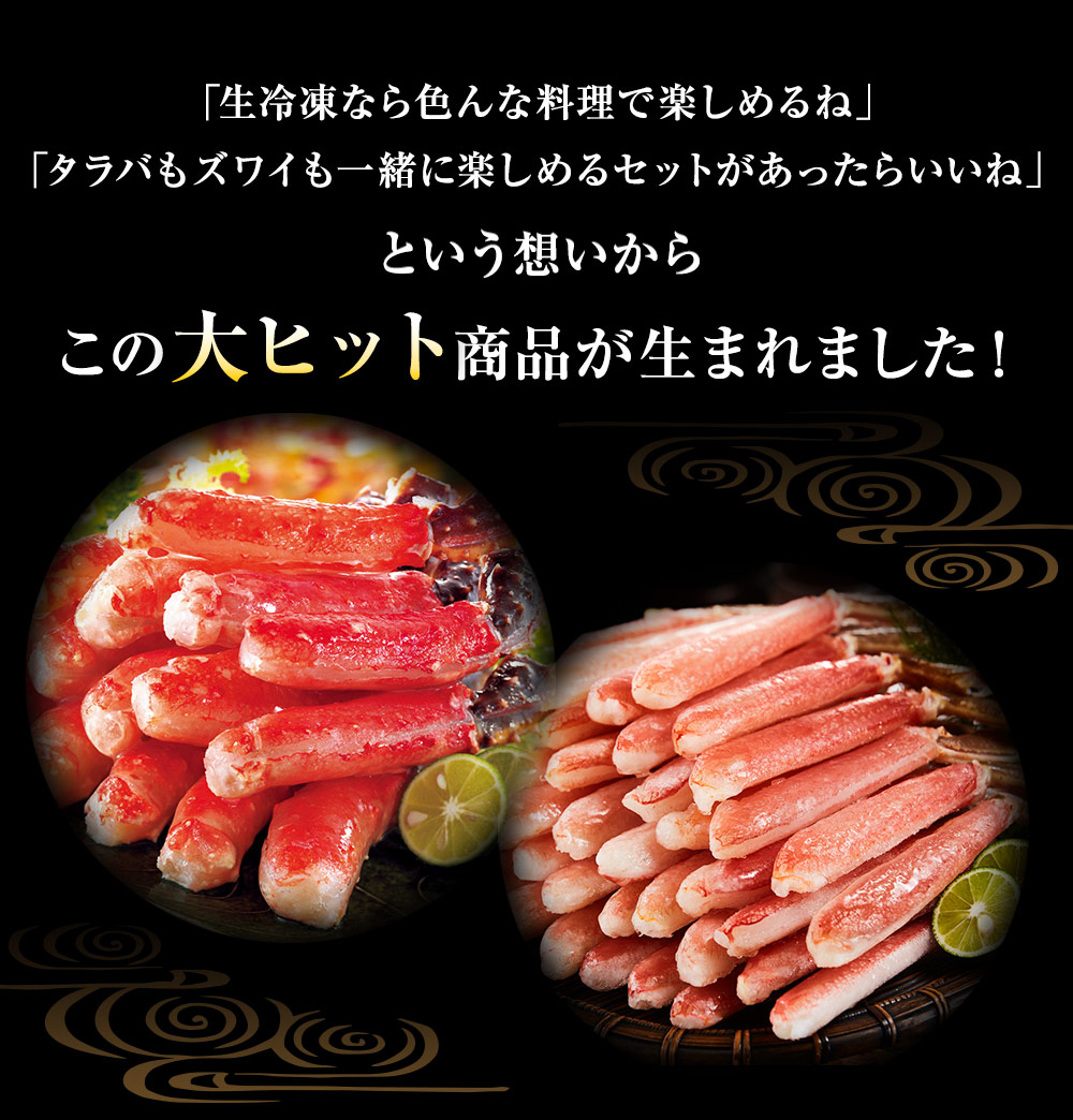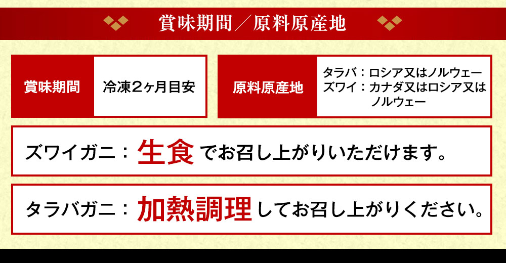◎生冷凍 - 賞味期間/原料原産地 冷凍2ヶ月目安/タラバ:ロシア又はノルウェー、ズワイガニ:カナダ又はロシア又はノルウェー