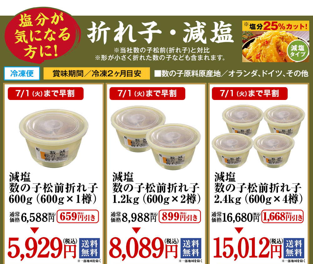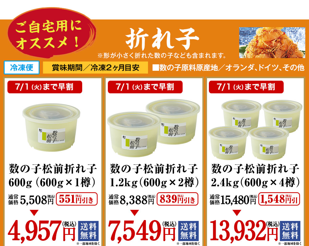 もう何度も何度も注文しています。折れ子と書いていますが、かなり大きめの数の子が、しかも沢山入っています。それでこのお値段!凄く美味しいし最高です!!キッキー様/40代 女性 ※個人の感想です。