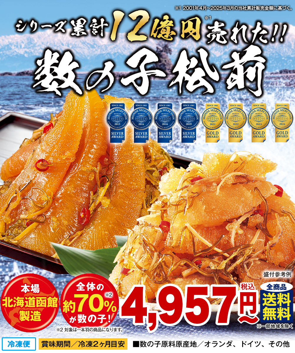 思った以上に数の子が多く入っていて、今まで食べなかった娘もおいしいと言って食べています。ただ贅沢かもしれませんが、数の子が本当に多くて松前の部分が物足りなくなってしまい、もっといかや昆布が入っていてもいいかなと思いました。きなこ様/50代 女性 ※個人の感想です。