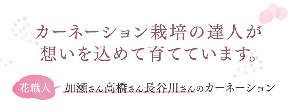 毎年4月、お届けするカーネーションが順調に育っているか、加瀬さん、高橋さん、長谷川さんの生産ハウスへ訪れ確認しています。また、出荷時の立ち合いも行い年に一度の母の日にお客様のお母様ひとりひとりが喜んでいただけるよう、品質管理を徹底して「開けた時の感動」をお贈りいたします。