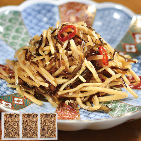 細切りのごぼうと昆布を醤油だれに漬け込み、低温熟成。