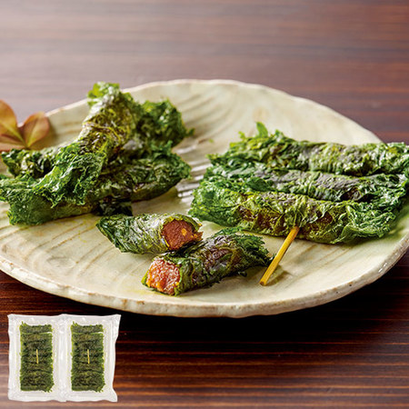 国産のしその葉で調味みそをていねいに巻いて油でパリッと香ばしく揚げました。