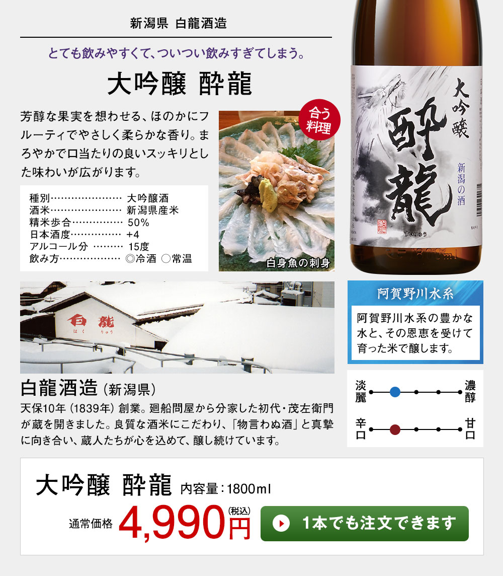 ■〈新潟県〉白龍酒造【大吟醸 酔龍】≪阿賀野川水系≫