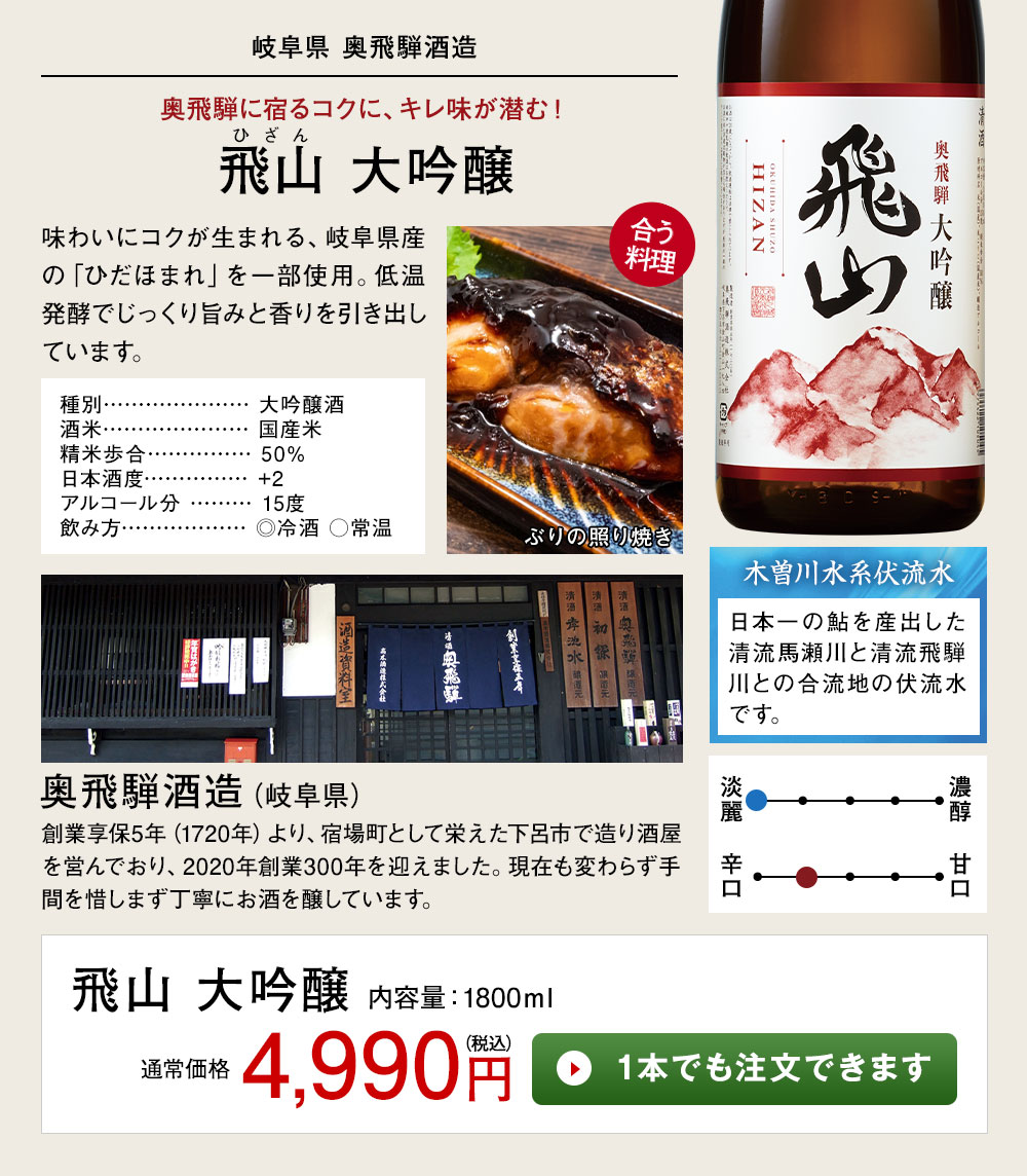 ■〈岐阜県〉奥飛騨酒造【飛山大吟醸】≪木曽川水系伏流水≫