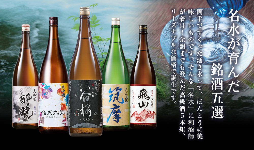 日本酒の約8割は、実は水で出来ています。ですから仕込む水の性格で、お酒の個性も大きく左右されます。今回、そんな「名水」に注目して日本全国から5蔵の5本を厳選、ベルーナ初の「水くらべの飲みくらべ」が実現しました。ひとりでも多くのみなさまに味わっていただきたいとの想いから、お得な価格で、さらにすべて大吟醸のみ!という「リーズナブルで贅沢なセット」をお届け出来る運びとなりました。