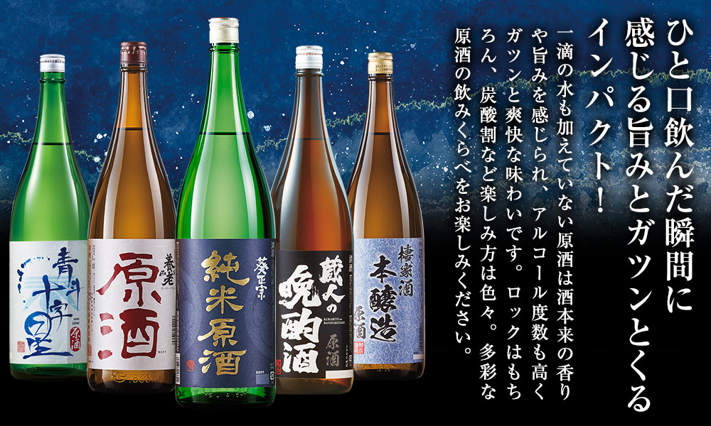 原酒とは、搾ったお酒にいっさい水を加えないものです。酒本来の香りや旨みが強く残る、風味豊かなお酒です。一般的なお酒(15度前後)にくらべアルコール分も高いため、常温・冷酒のほか、オンザロックやハイボールといった飲み方もおすすめです。