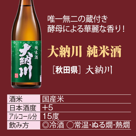 ■〈秋田県〉大納川※商品情報の「飲み方」は、特におすすめの飲み方に◎、おすすめの飲み方に○を付けて表記しています。※ラベル・銘柄が変わる場合がございます。※飲酒は20歳を過ぎてから。※飲酒運転は法律で禁止されています。※妊娠中や授乳期の飲酒は、胎児・乳児の発育に悪影響を与えるおそれがあります。※お酒は楽しく適量を。(株)ベルーナは一般酒類小売業免許を付与されています。