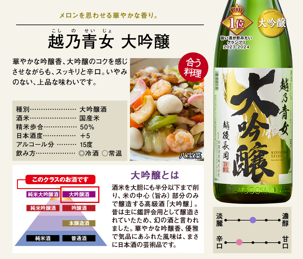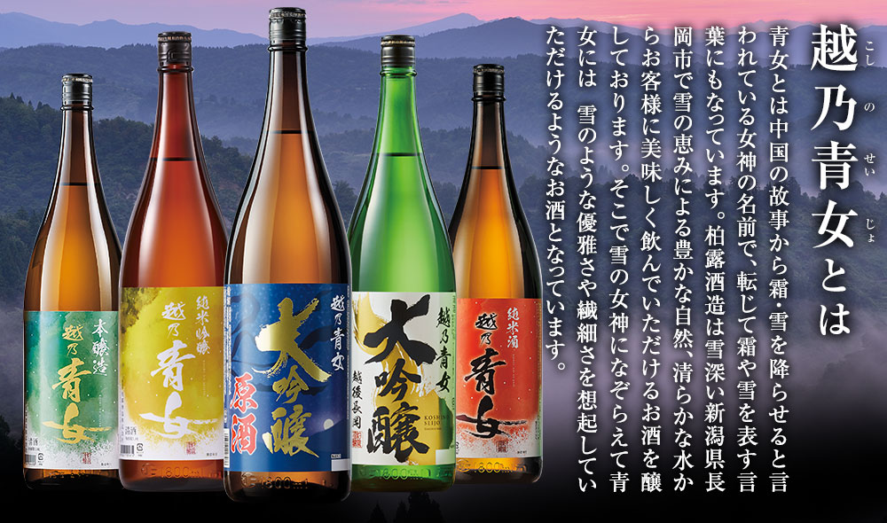 旨い酒グランプリで2連覇した大吟醸やコクのある大吟醸原酒など色々な味わいの越乃青女が楽しめます!