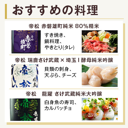 全国新酒鑑評会でも多くの金賞受賞実績を誇る、埼玉県松岡醸造の代表銘柄・帝松の飲みくらべセットです。岡山県赤磐市の赤磐雄町綺麗な旨味、新生・埼玉I酵母が生む果実感、さけ武蔵×少量仕込みの技。埼玉県の酒造好適米として知られるさけ武蔵は、特に高品質な日本酒の製造に使用されています。原料・造りの違いで多彩な香味と個性を堪能できる飲みくらべ3本組です。是非お楽しみください!