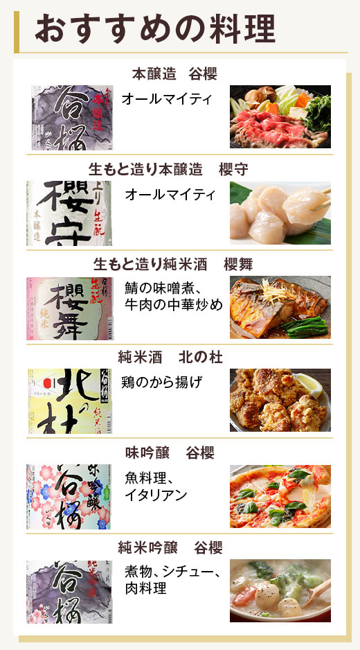 谷櫻酒造の魅力をまるごと楽しんでいただきたい6本セット。晩酌で日本酒が欠かせない人にはピッタリです。、吟醸酒から生もと造りまで、それぞれ違った個性が旨い!伝統的な酒造りで、日本酒本来の旨みを引き出しながら、キレある辛口な味わいは料理を引き立てること間違いなしです。