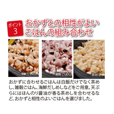 天ぷらにはほんのり醤油が香る茶めしを合わせるなど、おかずと相性のよいごはんを選びました。