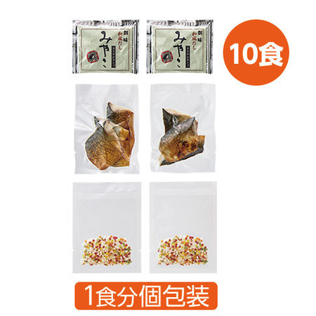 - お届け内容 さば塩焼き45g×10袋、五色あられ10袋、和風だし10袋