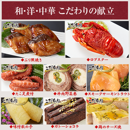 彩り紅白なます・チキンペッパー・田作り煮・一口にしん昆布巻・花餅紅梅・黒豆煮・百合根花盛り(梅)・ロブスター・合鴨野菜巻・栗入りきんとん・松前漬・味付数の子・ぶり照焼き・花餅白梅・いかの魚卵詰め・バイ貝甘露串