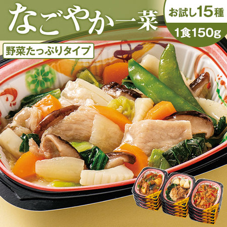 1食分の150g中、平均75g以上の野菜、5品目以上の食材を使用した、野菜たっぷりのおかずが楽しめます。