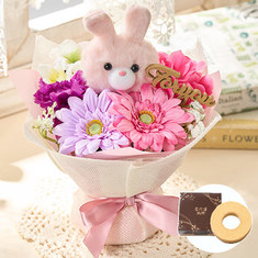フラワーアレンジメント(造花)、うさぎのぬいぐるみ、ラッピング、ピック、母の日カード、手引書4,389円税込