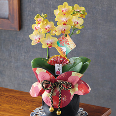 お申込締切:12月05日(金)迄お届け内容:●ミディ胡蝶蘭2本立ち(黄色系)、陶器鉢、不織布巾着、迎春ピック