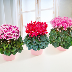 お申込締切:12月05日(金)迄お届け内容:●シクラメン「ひらり紫バイカラー」5号、「あげはピンクフレーム」5号、「ジックスレッド」5号、鉢カバー