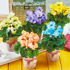 お申込締切:12月05日(金)迄お届け内容:●シクラメン ファンタジーカラー ライムグリーン4号、ディープブルー4号、レモンイエロー4号、アプリコットオレンジ4号、スカイブルー4号、底面給水鉢